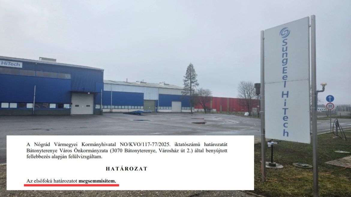 A SungEel Kft. bátonyterenyei akkumulátor-feldolgozója tavaly áprilisban kapott engedélyt a kapacitásbővítésre, amelyet Bátonyterenye önkormányzata bíróság elé vitte. Az önkormányzat követelése alapján a környezetvédelmi hatóság megsemmisítette az engedélyt, mivel az eljárás során nem értesítették a hatásterülethez tartozó Mátraverebély község jegyzőjét.